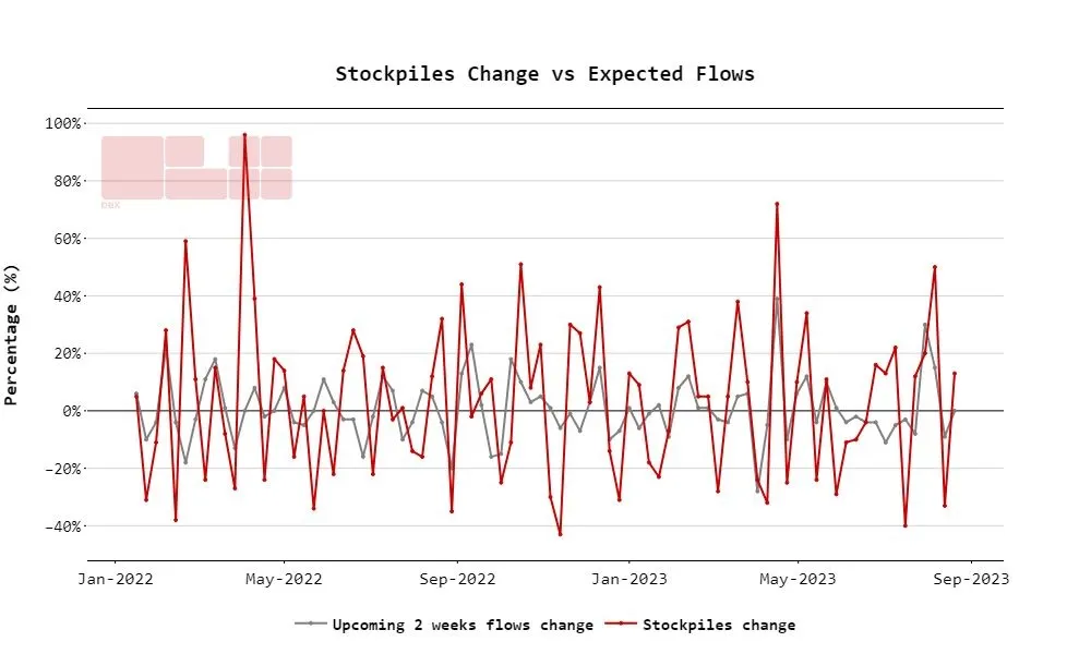 Our analysis reveals a 40% correlation between stockpile fluctuations and shipping flows in the next two weeks. This suggests that increases in inventories are likely to be followed by increases in shipping flows, offering key insights for market predictions.