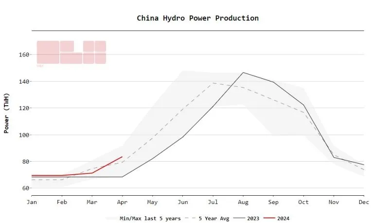 However, 2024 is shaping up differently. Chinese hydropower production surged to 83.5 TWh in April, an increase of 12.3 TWh compared to the previous month and a 15.1 TWh increase compared to the same month last year. Chinese hydropower production is now back in line with the 5-year range.