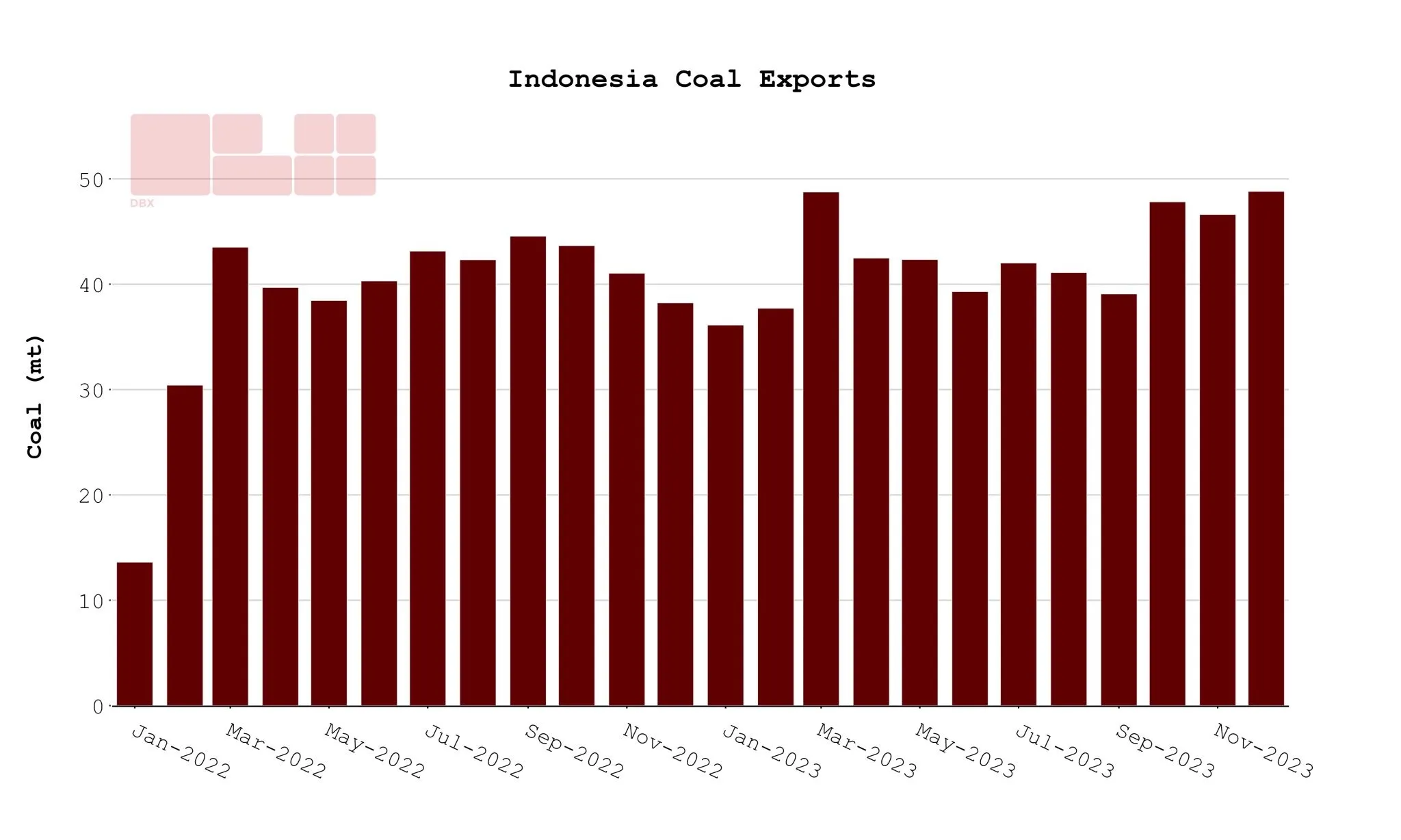 DBX forecasts that Indonesian coal exports will reach almost 50 million tones, marking an all-time high for the country. The coal-friendly political environment in Indonesia is enabling miners to increase production from existing mines and develop new ones. Additionally, fair weather conditions are contributing to fewer operational disruptions, with healthy water levels facilitating smoother river transportation and barging in Central and East Kalimantan.